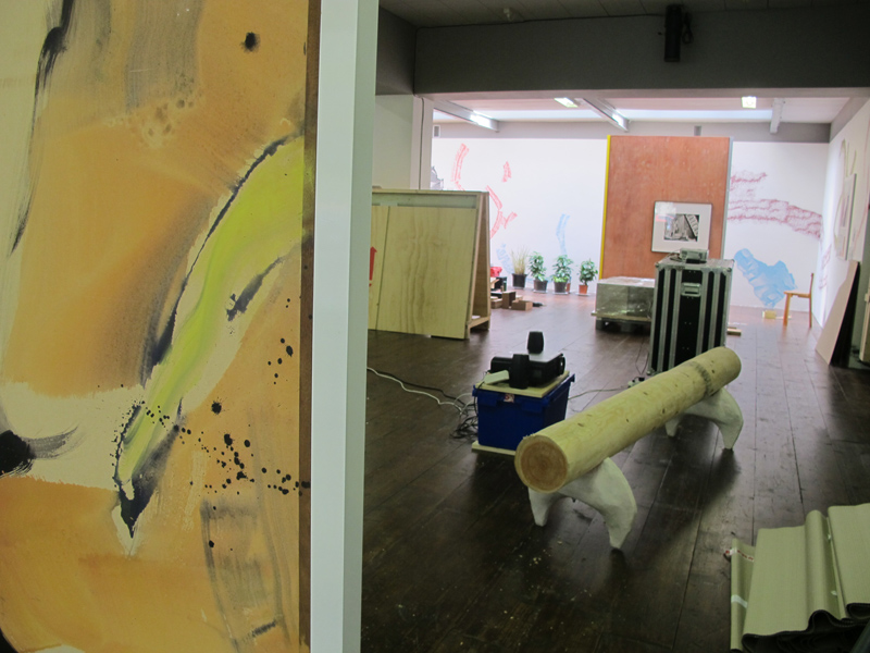 Ik heb echt het gevoel dat alles nu klopt in deze tussenperiode ook met de lezingen en performances. Dat deze periode werkt omdat het een echt functionerende werkruimte is, ook de kunstwerken worden nu niet getoond, maar ‘werken', ze leven. En dat komt vooral doordat het geen decor is, het is een werkelijkheid, het is niet dood geënsceneerd, de opbouwers plaatsen materiaal daar waar het uitkomt, niet esthetisch overdacht, maar waar het moet staan om mee te kunnen werken.